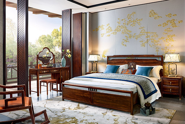 從傳統到現代,新中式家具保留了東方特有的元素與工藝,精密巧妙的造型結構,在一榫一卯之間、一轉一折之際,流露出中國幾千年傳統文化的精粹。空間中繁密且律動成韻的木格柵,每一條橫平豎直的線條,在最大不同程度上聯系了人與自然,獨立又相融。