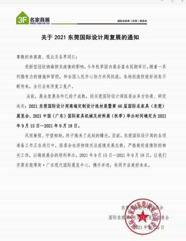 當(dāng)前,展會(huì)復(fù)展條件已趨于成熟,經(jīng)組委會(huì)多方協(xié)商,研究決定;第41屆國際龍家具展覽會(huì)將于2021.09.13-2021.09.16如期開啟。2021東莞國際設(shè)計(jì)周高端定制設(shè)計(jì)選材第46屆國際名家具(東莞)展覽會(huì)、2021中國(廣東)國際家具機(jī)械及材料展(秋季)舉辦時(shí)間確定為2021年9月15日-2021年9月18日。